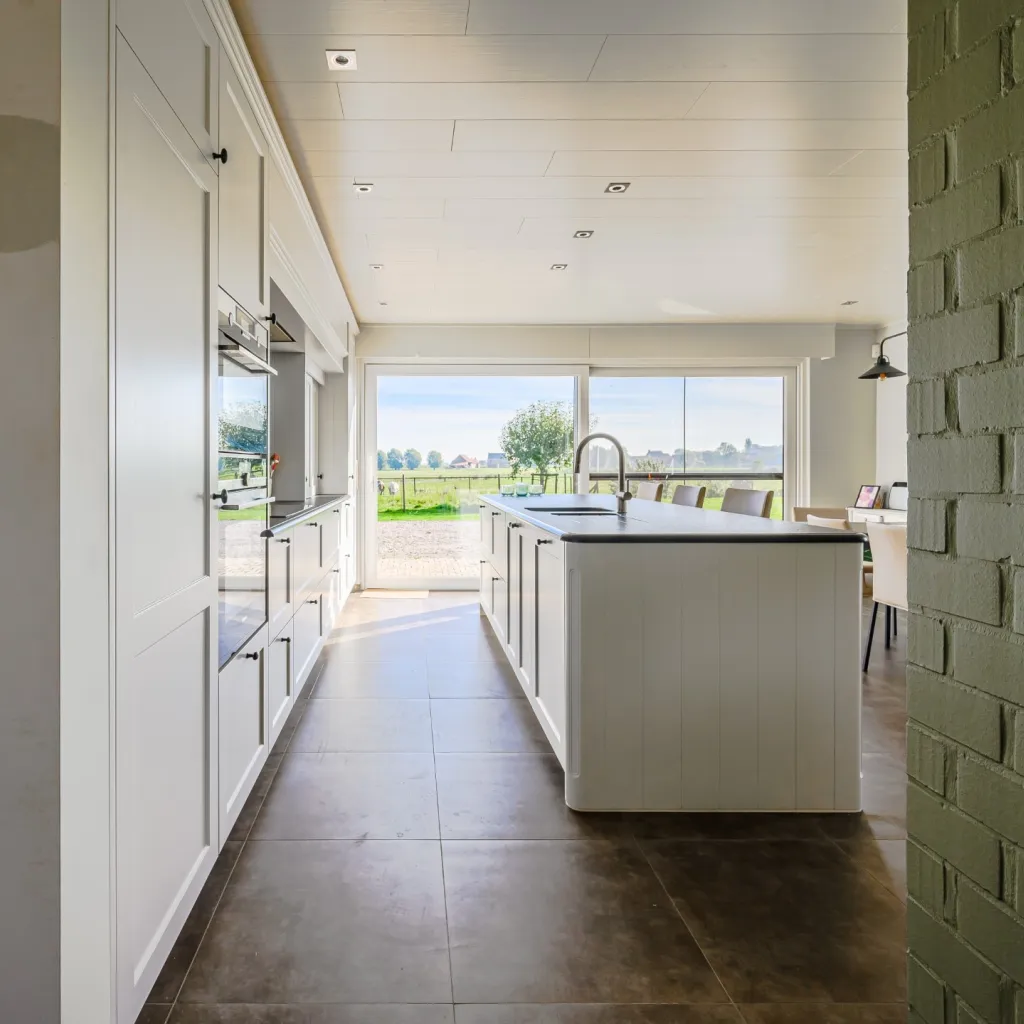 Ontdek de verfijning van donkerkleurig graniet in de landelijke keukenrealisatie van Wackenier Natuursteen voor een klant in Diksmuide.