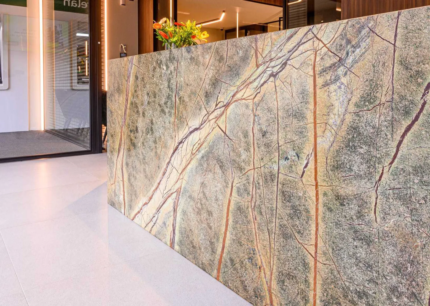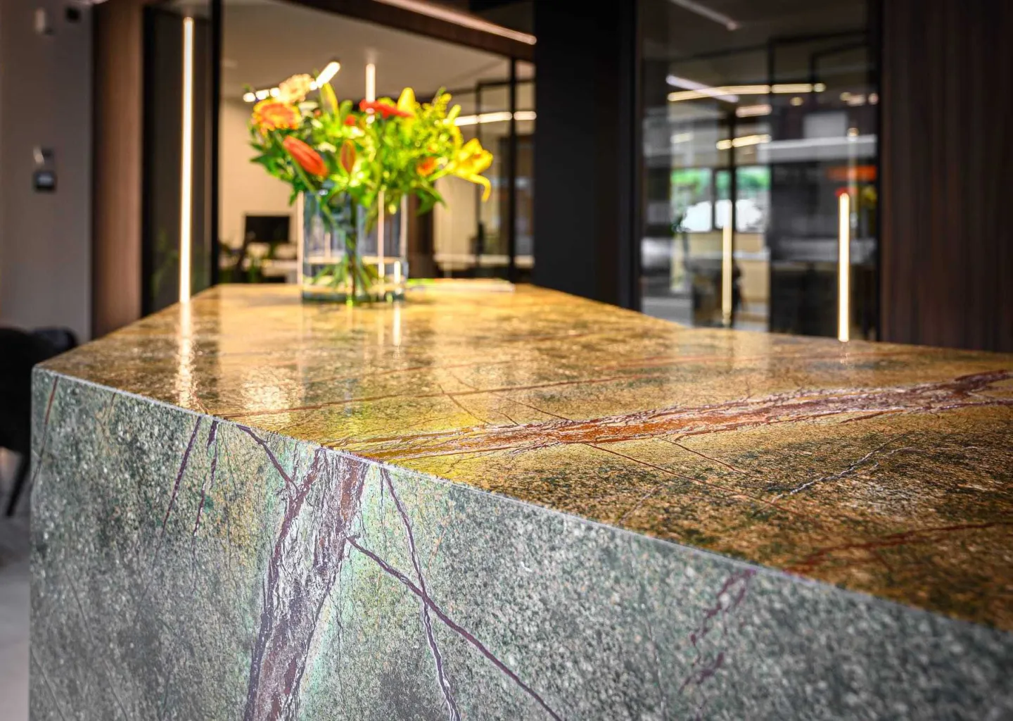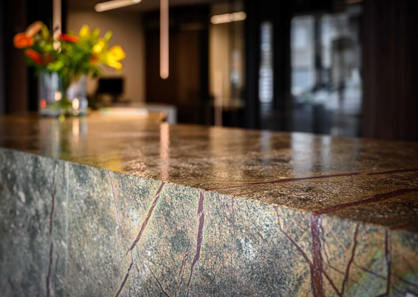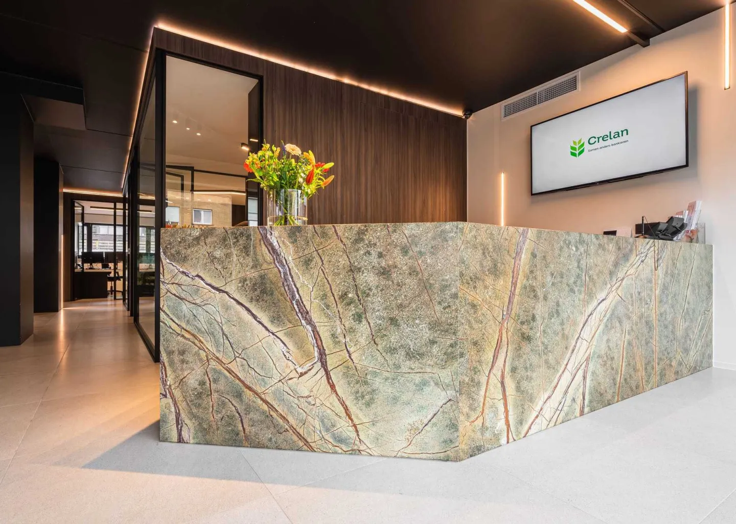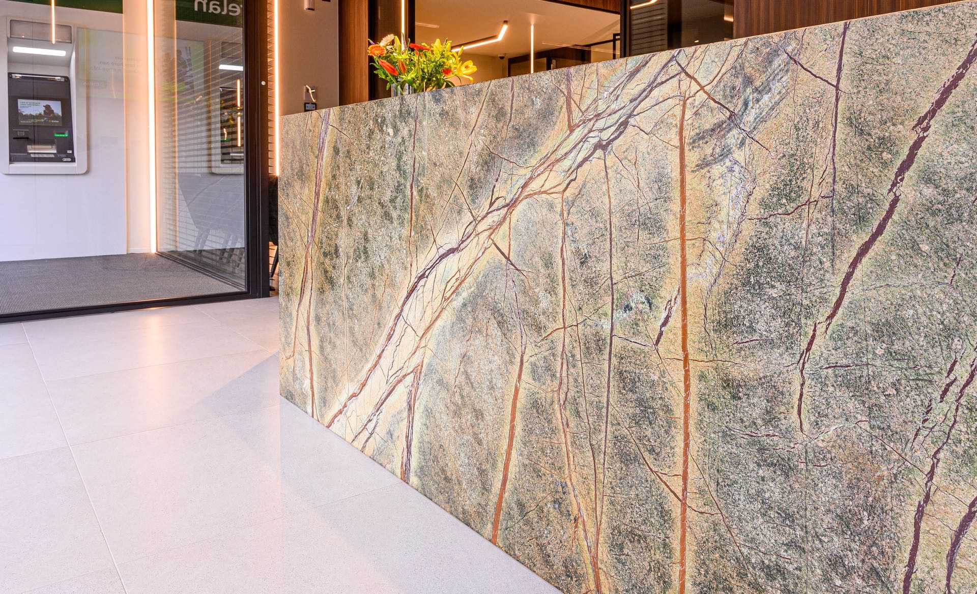 Deze ontvangstbalie is niet zomaar een functioneel meubelstuk. Het is een statement. Een eerste indruk voor klanten die de bank betreden. De kleurrijke patronen van het Forest Green marmer vormen een opvallend contrast met het strakke interieur van de bank, waardoor het een onmiddellijke blikvanger is.